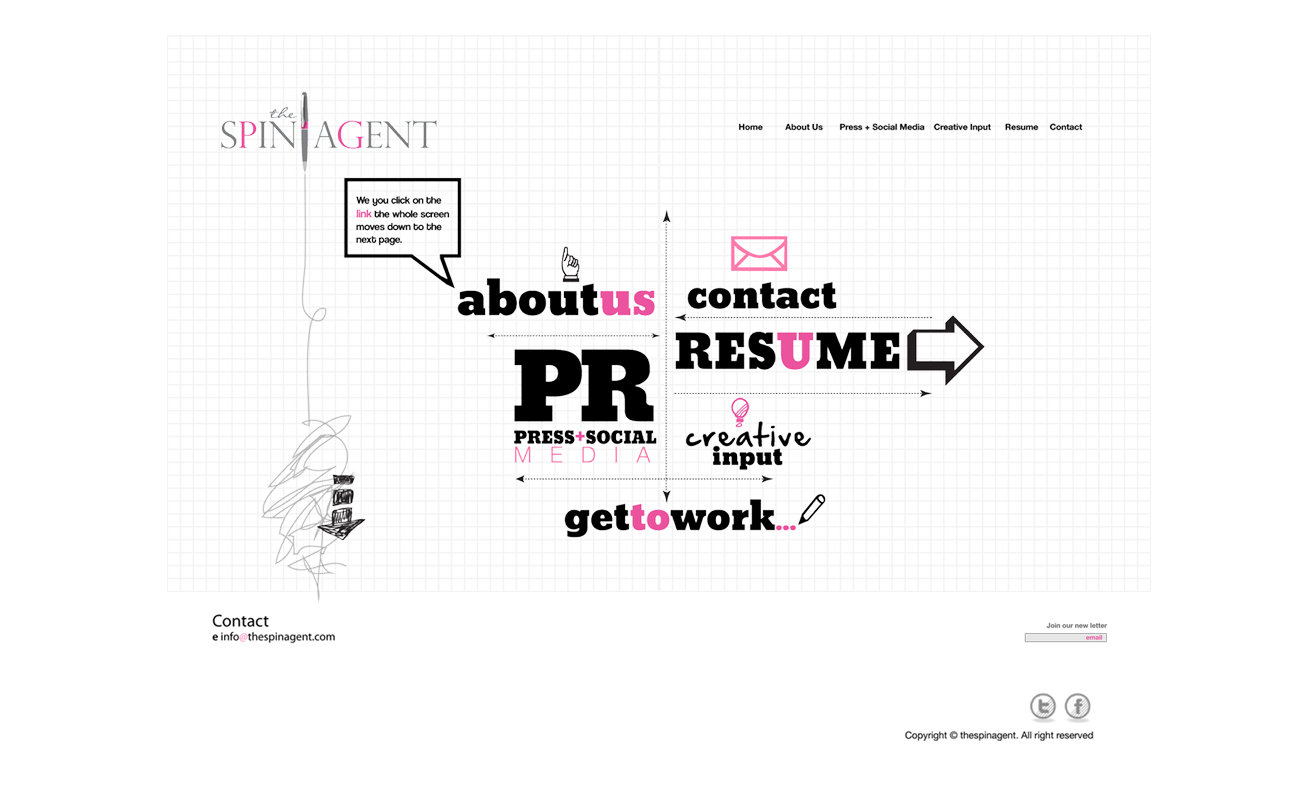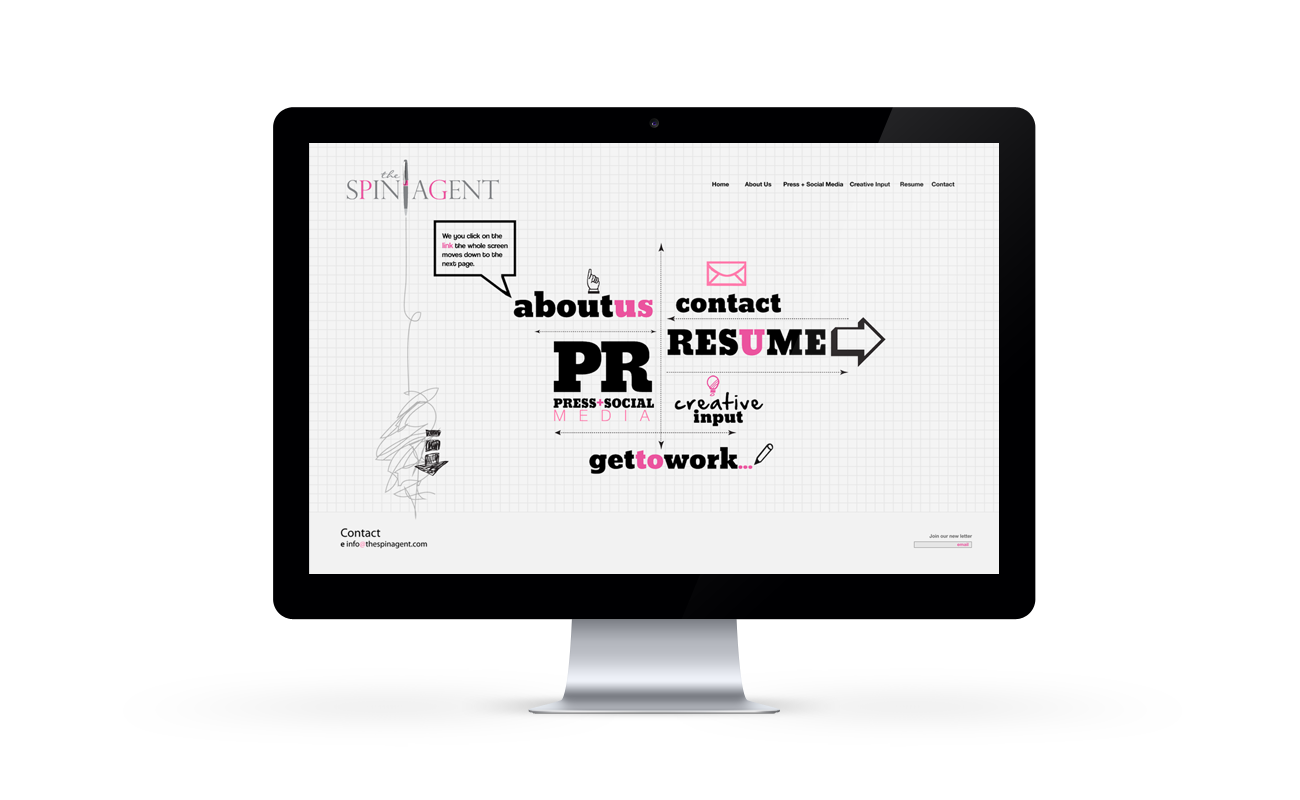 Spin Agent is a New York City Public Relation Firm. Client wanted the following: informative site about company services, interactive site and a design that express an "hands on approach". The draft paper background, adding vector graphic elements and the font style is a perfect combination of creativity and organize confession.